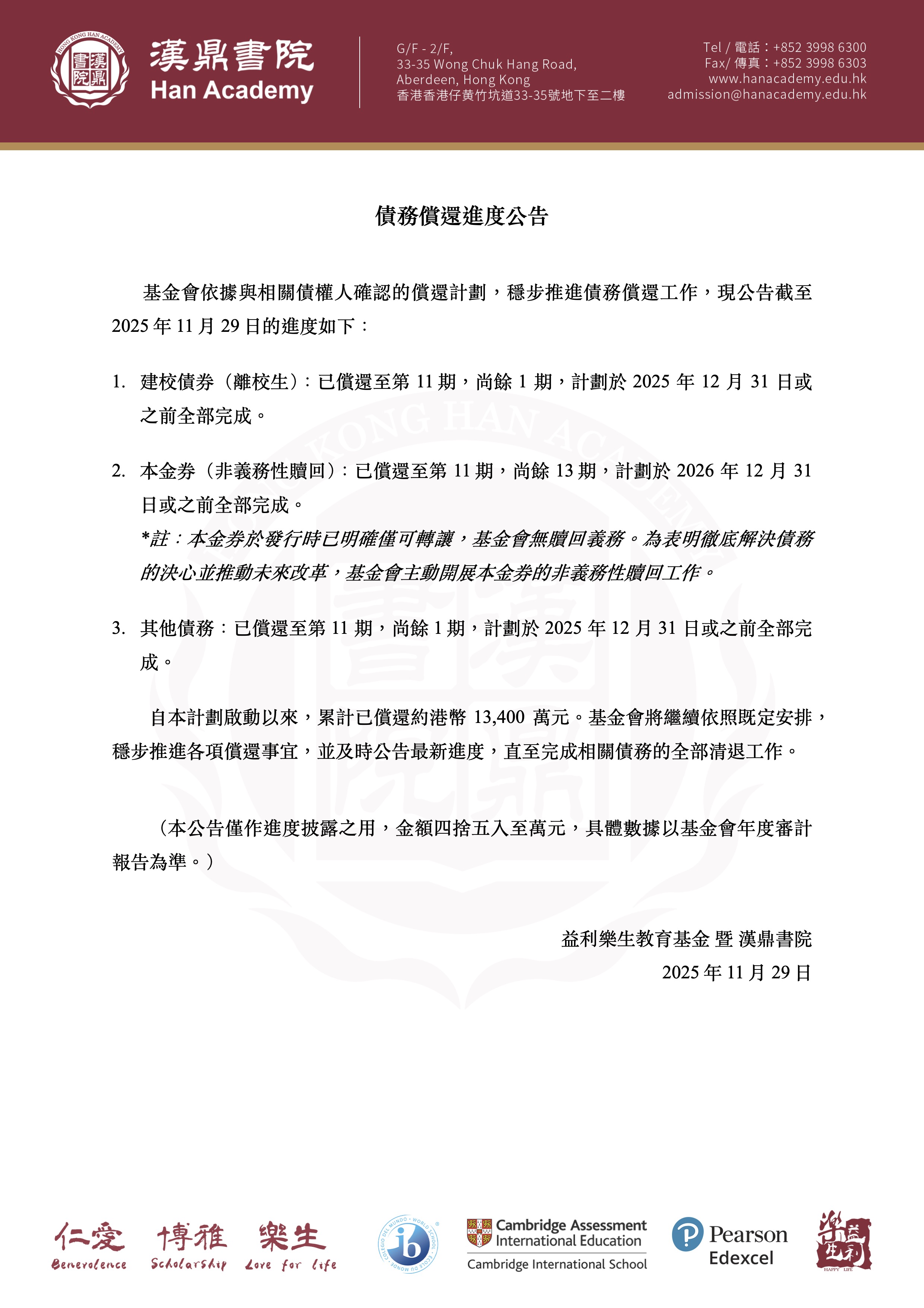 自本計劃啟動以來,累計已償還約港幣 13,400萬元。基金會將繼續依照既定安排,穩步推進各項償還事宜,並及時公告最新進度,直至完成相關債務的全部清退工作。